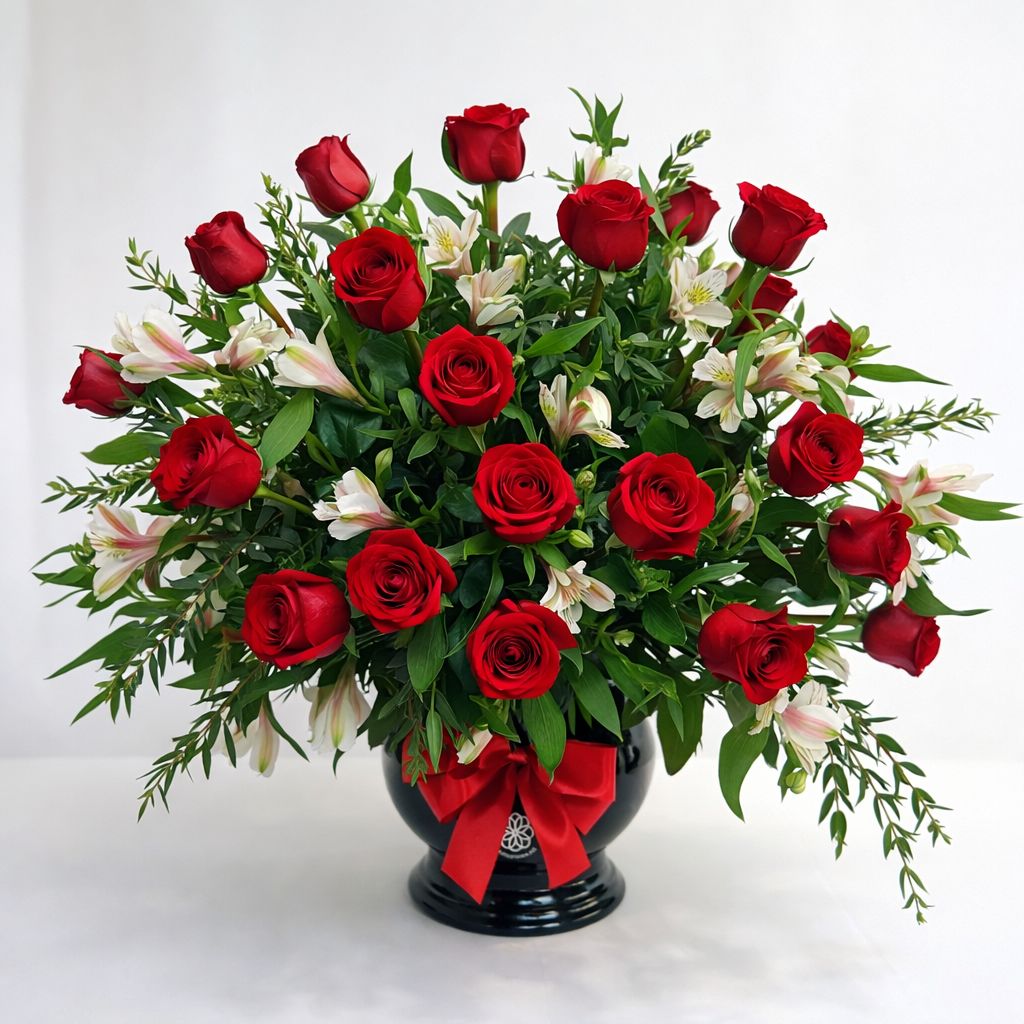 Elegante arreglo de 18 rosas rojas con follajes y flor de temporada