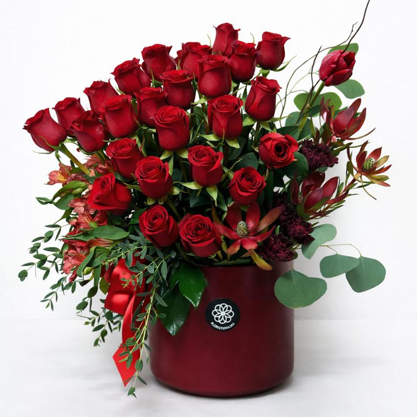 Arrweglo floral romántico en base de cerámica color rojo quemado. Este arreglo floral es una combinación perfecta entre rosas rojas y flores de las mismas tonalidades, con un toque de tulipanes.